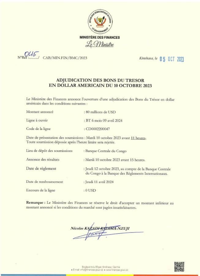 Le gouvernement de la République démocratique du Congo (RDC) poursuit sa stratégie de mobilisation des ressources internes. Dans un contexte économique exigeant, l’État congolais vient d’annoncer une nouvelle opération de levée de fonds de 80 millions de dollars américains sur le marché financier local, une initiative qui s’inscrit dans sa politique de financement domestique et de soutien au développement du marché des capitaux congolais.